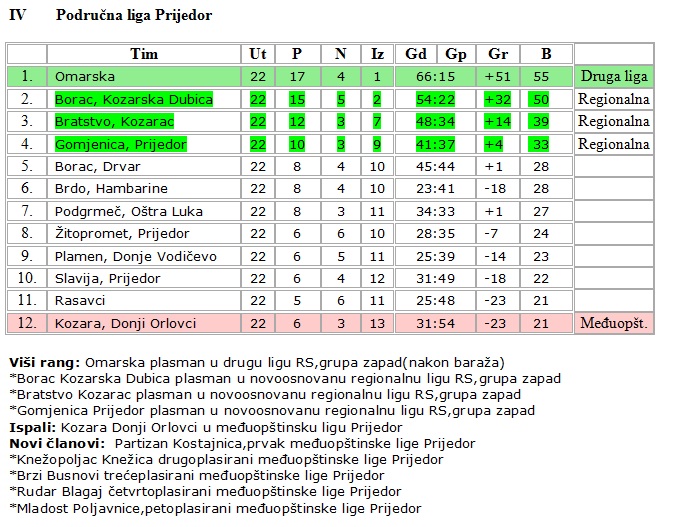 pobjede tako da je razlika stalno bila 7 bodova. Odlučujuće utakmice su bile u Kozarcu i protiv Dubice u Omarskoj. U Kozarcu smo slavili sa 1-0, a sa Dubicom smo kod kuće odigrali neriješeno 1-1, zadržali bodovnu razliku i faktički rješili prvenstvo. Titulu smo i formalno ovjerili trijumfom u Orlovcima nad Kozarom 2-0, a do kraja prvenstva smo sebi dozvolili luksuz da odigramo neriješeno sa Slavijom i da izgubimo u Drvaru 3-0.