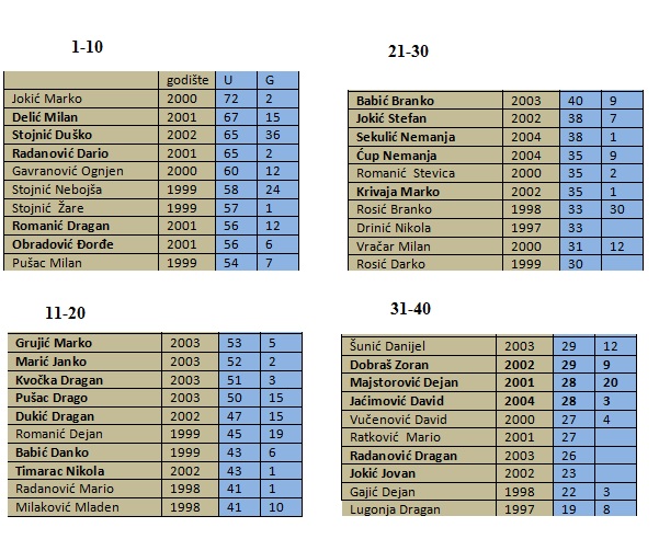 I dalje najviše nastupa ima Jokić Marko, ali su mu za petama Delić, Stojnić i Radanović. Takođe, gužva je za ulazak u top 10, gdje će svoje mjesto uskoro izboriti Grujić, Marić, Kvočka, Pušac i Dukić.