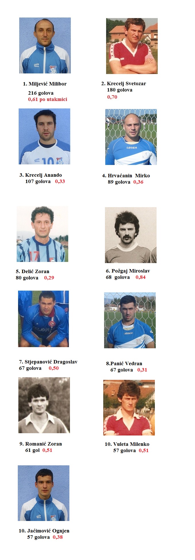 Po završetku sezone 2019/20 donosimo Vam i ažuriranu listu top 10 strijelaca u istoriji kluba. Nije bilo promjena u odnosu na kraj prošle sezone, osim što su Krecelj i Panić sa po 6 golova popravili svoj bilans. Ipak, uskoro će biti promjena sasvim sigurno jer na vrata Top 10 kuca Rosić Branko sa do sada postignutih 56 golova.
