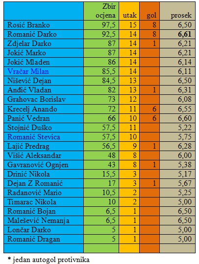 Jokić 5, Lajić 5, Zdjelar 5, Grahovac 5, Rosić 5,5, Romanić Da 5, Panić 5, Gavranović 5 (Romanić S -), Anđić 5, Vračar 5 (Stojnić -), Višić 5 (Jokić -)
