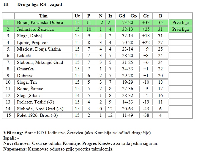 Što se tiče same lige, na kraju je Borac iz K. Dubice osvojio prvo mjesto, a FSRS je donio odluku o proširenju prve lige, pa je administrativnim putem popunjavao i prvu i drugu ligu. Zbog svih tih odluka iz druge lige niko nije ispao.