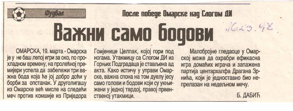 Žuti kartoni: Zrnić, Delić (Omarska), Marjanović, Šinik (Sloga)